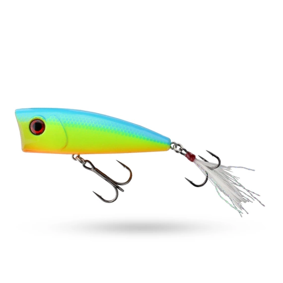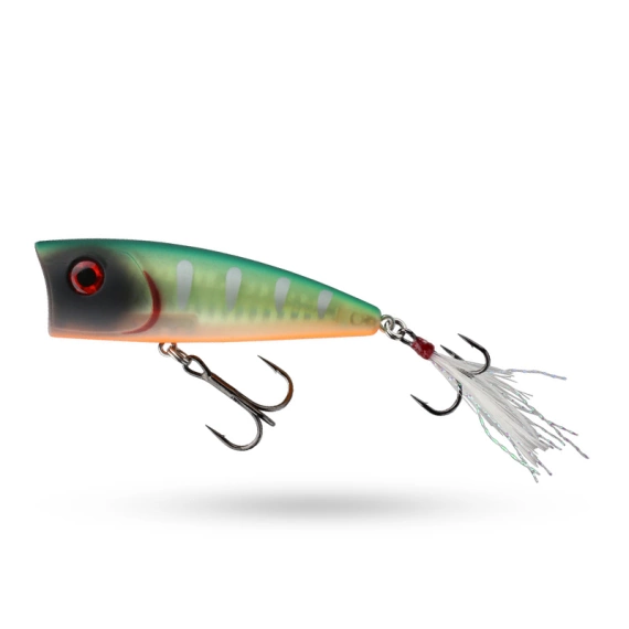 Top-X är utrustad med Hurricane’s 301GS trekrokar vilket säkerställer att du har starka och vassa krokar, kast efter kast. På grund av att främre kroköglan sitter något längre bak än normalt hakar nästan aldrig Top-X sig fast i huvudlinan. Fjädrarna och tinslet på bakre kroken agerar både som huggpunkt men ser även till att kroken håller sig horisontal mellan poppandet, vilket ökar antal krokad fisk.