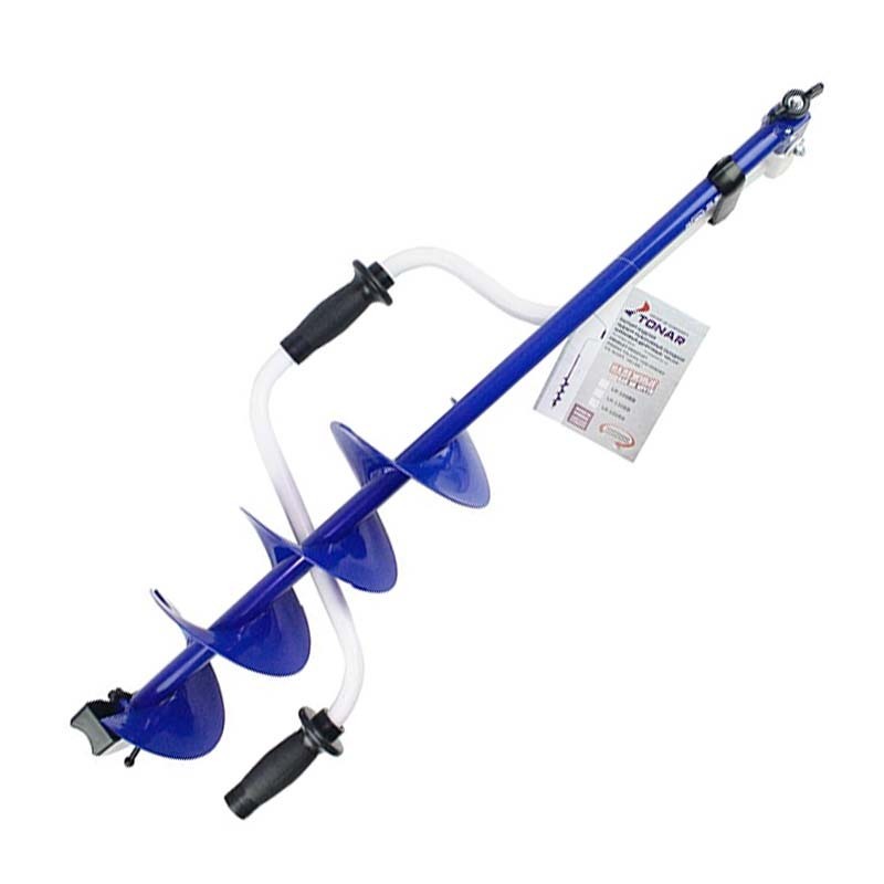 Tonar Isborr Helios är isborrar där det översta handtaget är placerat 130 mm från spiralens axel och det lägre 150 mm från axeln. Det gör att du är mer effektiv i ditt borrande med två händer som driver spiralen. Knivarna har en halvcirkelformad design och garanterar snabba och enkla hål, även i våris.